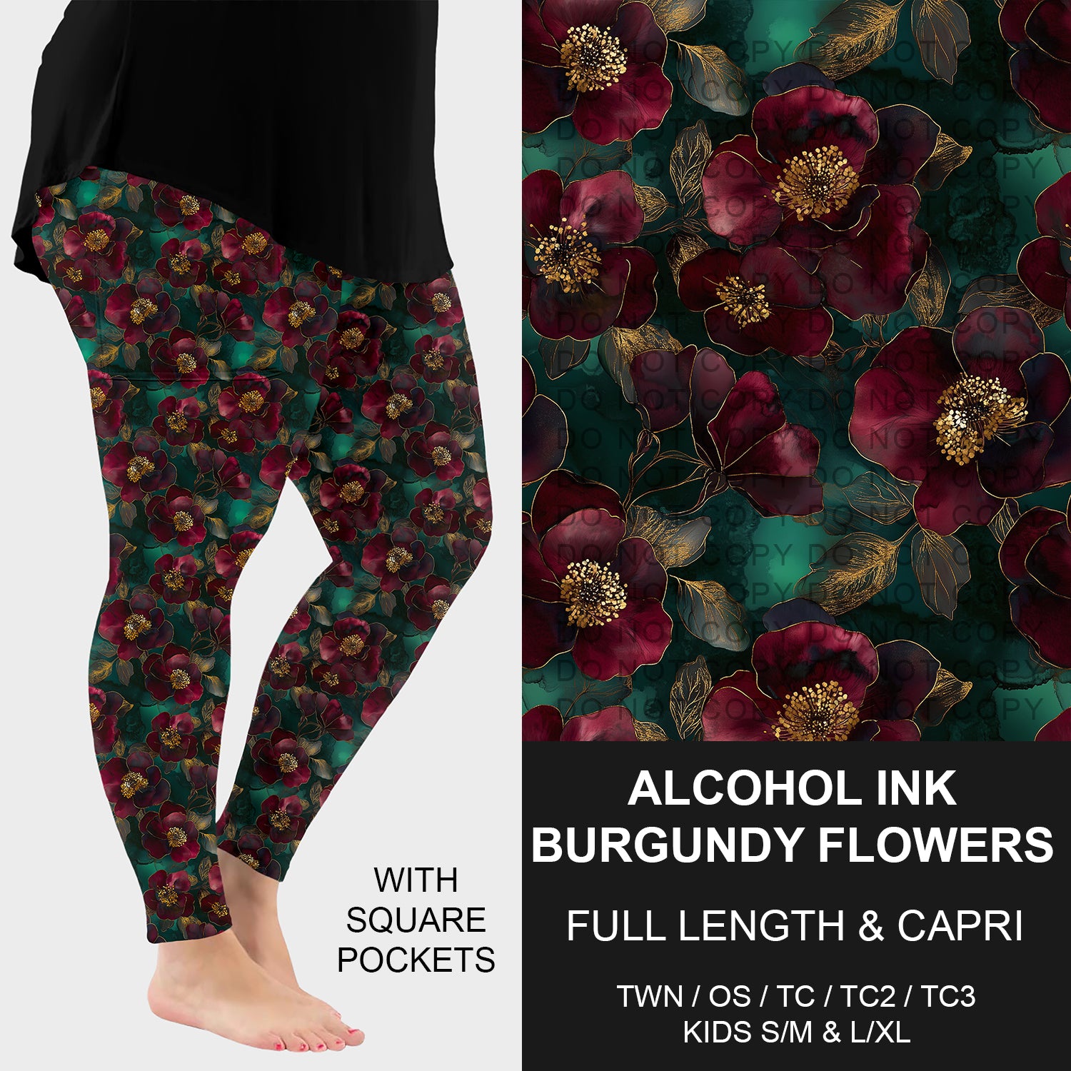 Pre-Order Alcohol Ink Burgundy Flowers Leggings w/ Pockets (ETA: mid Jan.)